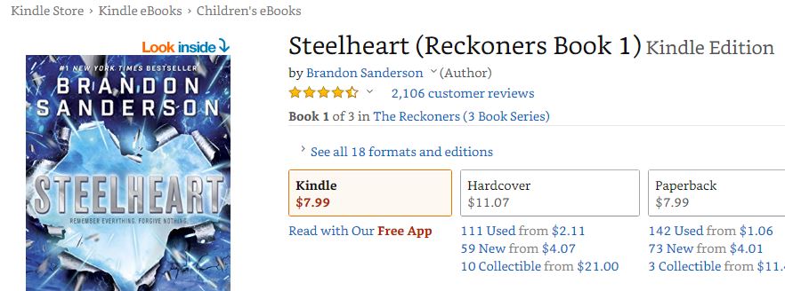 Since "Steelheart" has received 2,106 reviews, we can infer that 210,600 people have purchased a copy of this super hero fiction story.